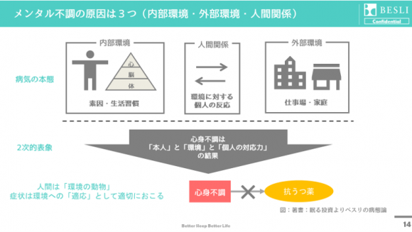 適応障害に対する薬物療法や休職自体は、ゆっくり休む養生であり「疲弊した心身の回復」のための対処療法です。