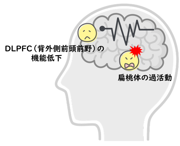 背外側前頭前野(dlPFC)の機能低下と扁桃体の過活動です。