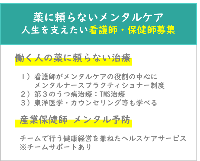 神田駅の東口1分にあるビルの8階、7階、5階がクリニックであり、8階で急性期の治療、7階にてT MSとカウンセリング、5階は集団療法ルーム(リワーク)となっており、計60名のスタッフとともに薬に頼らずどのように問題解決をしていくかを目指し患者様と協同的医療を目指しています。