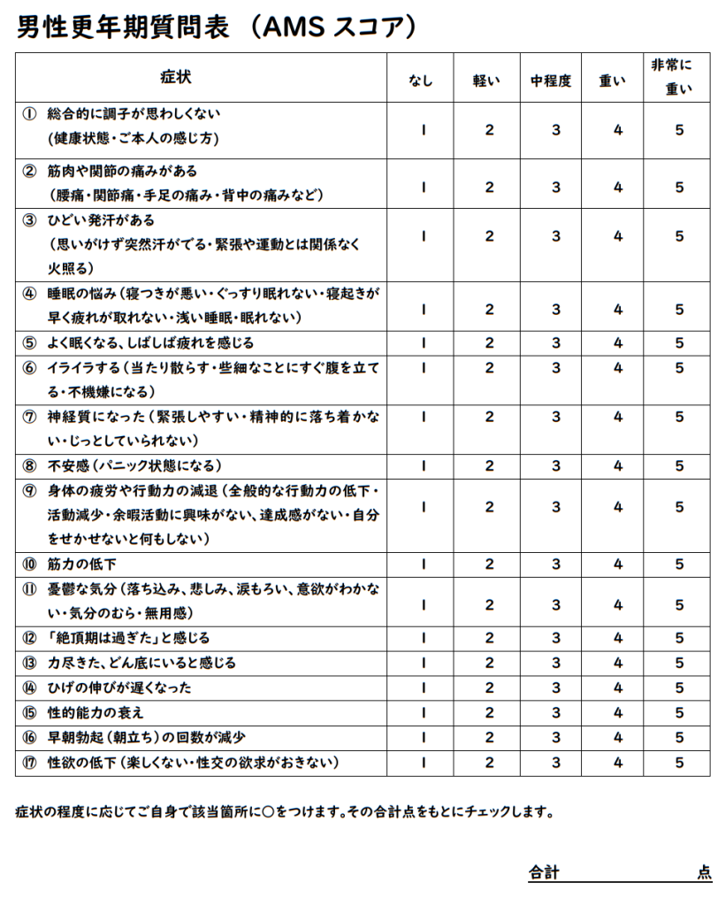 問診では主に、AMSスコア(身体、心理、性機能の側面での状態評価)による検査を行っていただくとともに、治療の際に重要になる前立腺肥大症の症状などについても確認します。