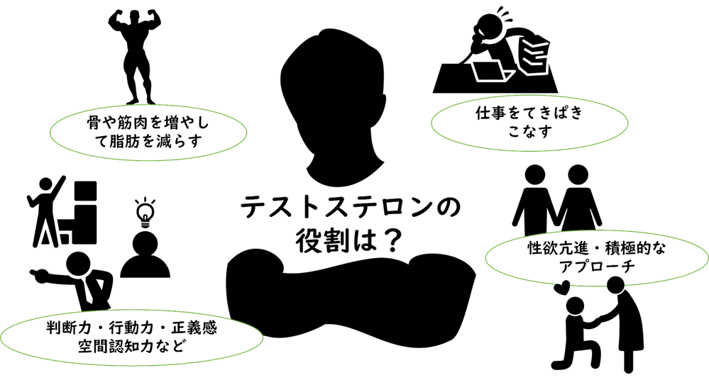 テストステロンは主に精巣から産生されるホルモンで、以下のような働きがあると言われています。