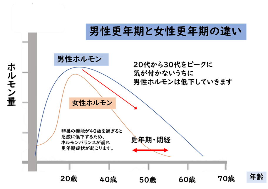 女性の更年期の場合は閉経の際に比較的短期間で変化が起きますが、男性の場合には加齢に伴いジワジワと変化が起きるのが特徴です。