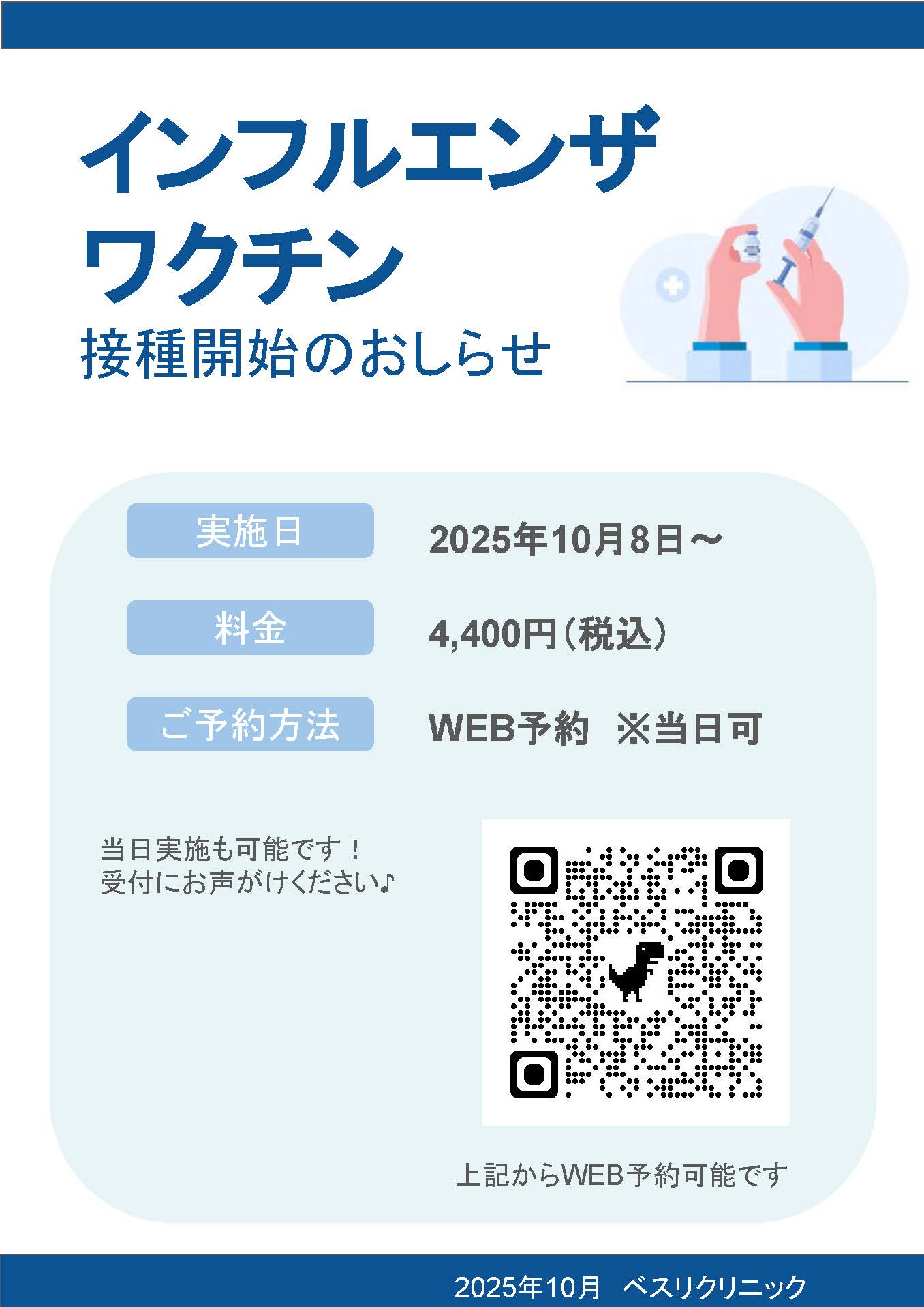 【接種開始しました】2025年度インフルエンザ予防接種2025.10.09インフルエンザワクチン 接種開始のお知らせ10月8日(水)からインフルエンザワクチンの接種を開始しました。予約ページはこちら今年はインフルエンザの流行が例年より早いため早期接種が望ましいと言われております。ご不明な点がございましたら以下よりメールでお問い合わせください。ベスリクリニック神田お問い合わせ 日曜日診療のお知らせ前の記事