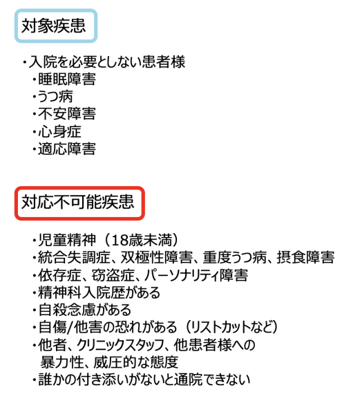 希死念慮、自殺企図などの治療は対応しておりません。あらかじめご了承ください。