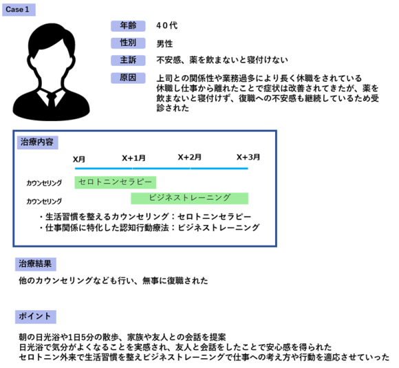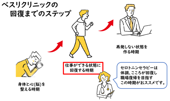 うつ状態の回復期に重要なセロトニンやオキシトシンといったホルモンを分泌しやすい生活習慣をつくっていくためのアドバイスを行っています。